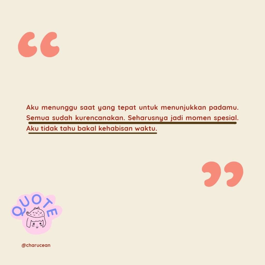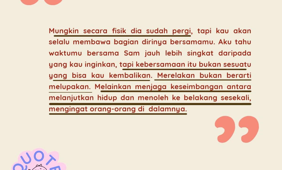 Aku belajar cara untuk merelakan. Tidak mudah memang. Kehilangan tidak pernah bisa diubah lagi. Pada akhirnya mereka takut saling melupakan. Tapi, dunia terus berjalan dan waktu tidak bisa dibekukan atau bahkan dikembalikan. Aku belajar pada dasarnya kenangan itu akan terus tersimpan dan kita tetap bisa melanjutkan hidup dengan kenangan itu.